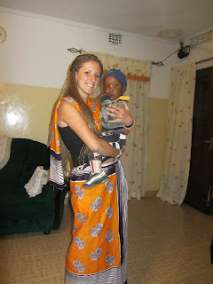 I bought a Kanga (you buy two of the pieces of fabric described on this page as a pair) at Tengeru Market yesterday and last night I experimented with tying it onto myself (there are about a million different ways that it can be done and no set formula). All of the little kids in my house were laughing at me as they watched me struggling with it... haha.